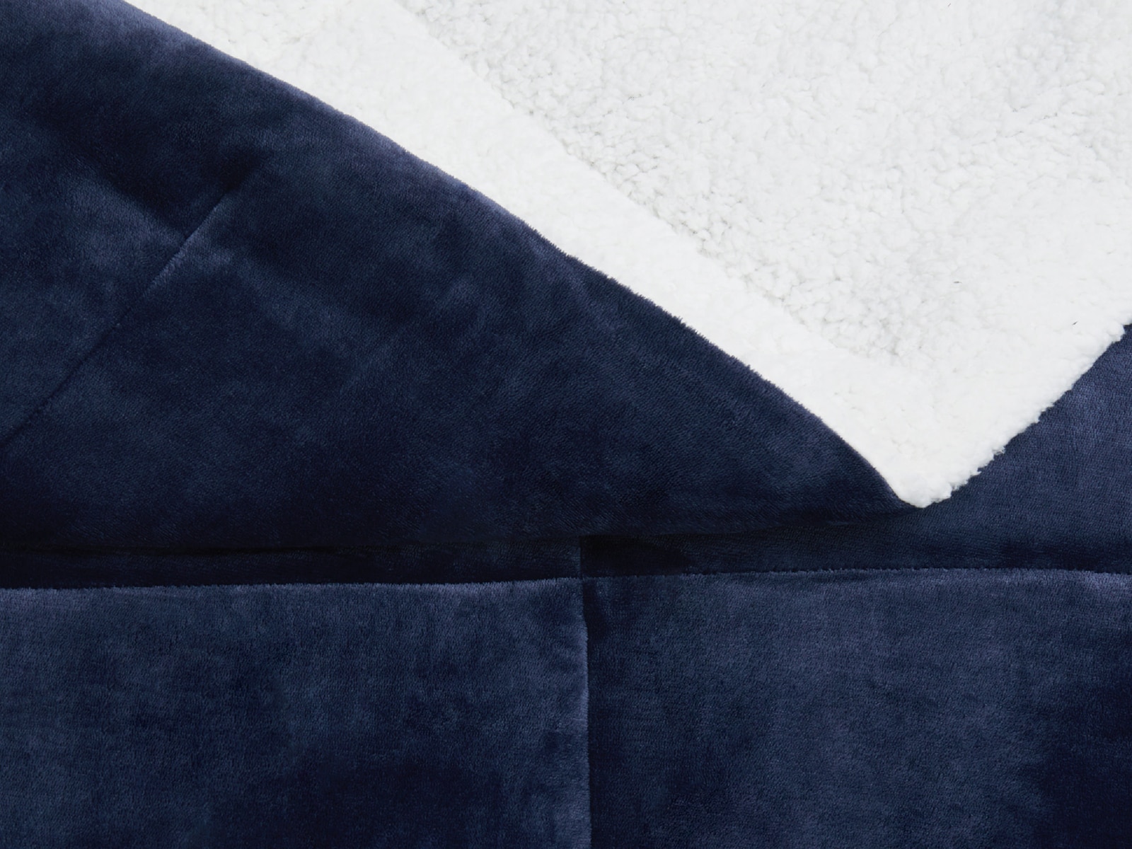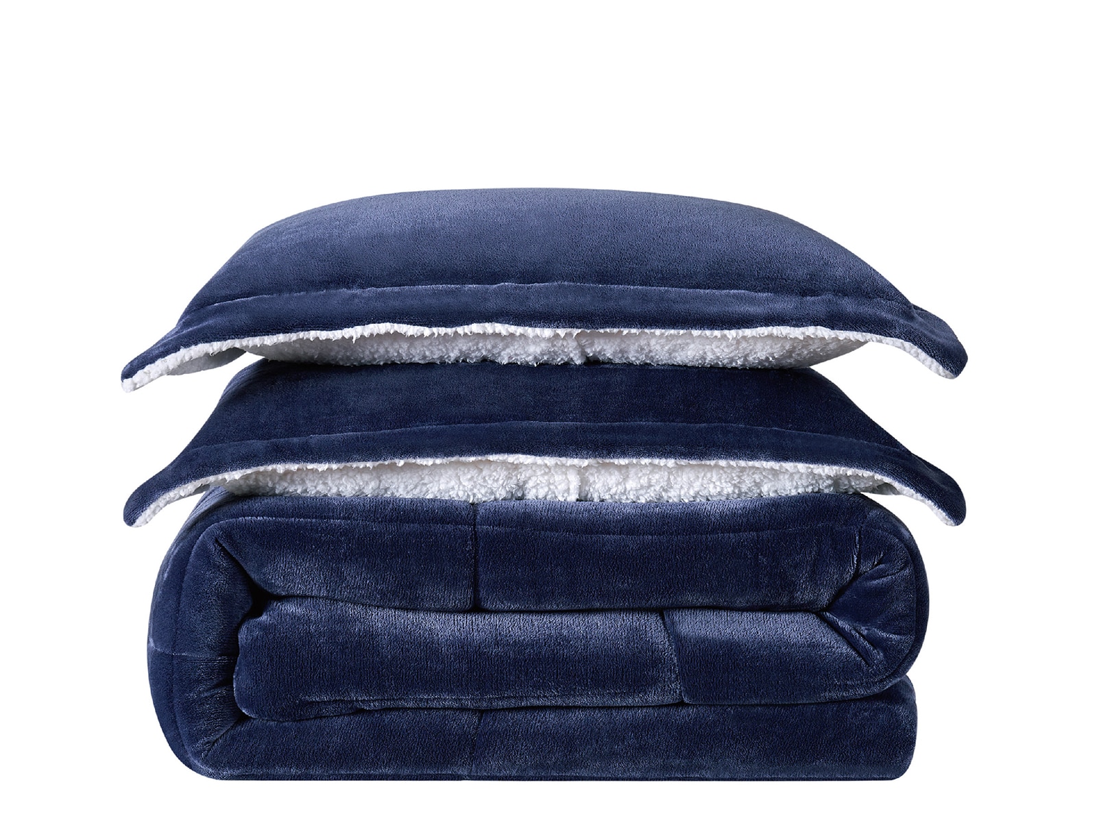 Solid color velvet face cloth reverses to a luxurious sherpa plush fabric in designer solid colors for the Cuddle Warmth Comforter Set. The fabric provides the ultimate in softness and is great for cold nights. The polyester velvet face cloth is durable and able to handle high traffic areas. As an added bonus, these sheets are benzoyl peroxide-resistant so that you can sleep in your acne medication without fear of damaging your item. Face is 100% polyester mink reversing to 100% faux sherpa and filled with 100% hypoallergenic down alternative polyester.